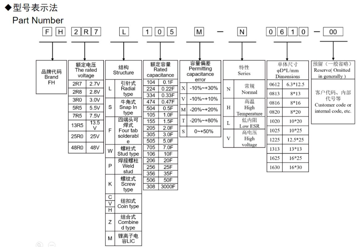 風華高科高壓系列圓柱型超級電容器型號命名規則: