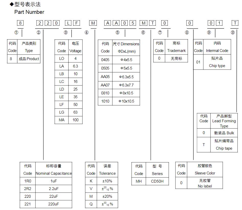 風(fēng)華高科MH系列鋁電解電容器型號(hào)命名規(guī)則: