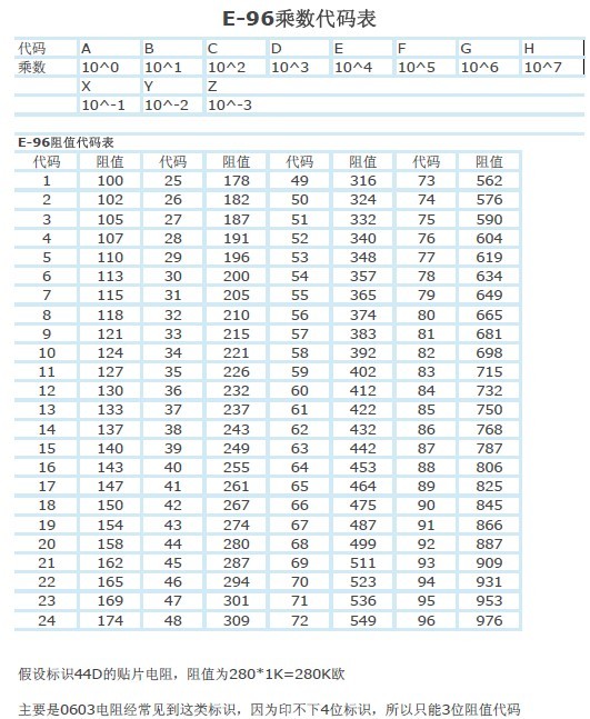 貼片電阻E-96 系列(0603)公稱阻值代碼對照以及乘數代碼對照表: