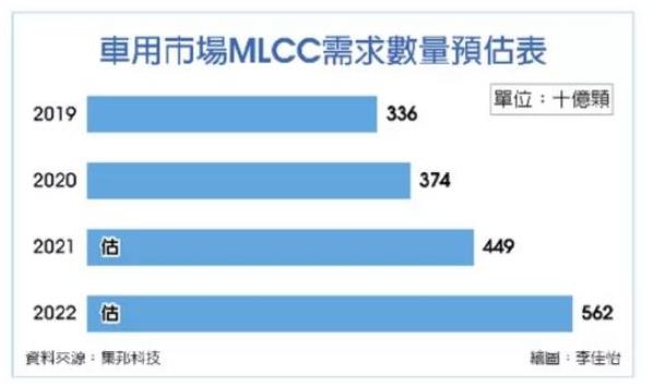 盡管消費(fèi)性產(chǎn)品需求轉(zhuǎn)弱,但自第三季起至今,汽車市場維持強(qiáng)勁的需求,成為供應(yīng)商在新產(chǎn)品規(guī)劃與產(chǎn)能擴(kuò)增的重點方向。預(yù)估2021、2022年車用MLCC需求將上看4,490億顆、5,620億顆,年增率將達(dá)20%、25%。