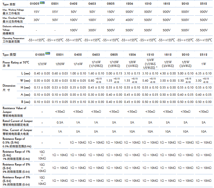 產品封裝:01005/0201/0 603/0805/1206/1210/2010/2512...
